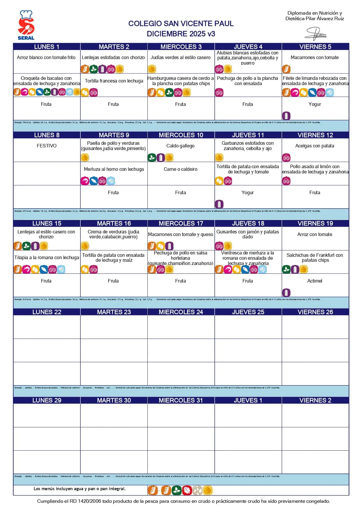 الإسبانية SIN NUEZ بدون مكسرات SIN LAUREL بدون فاصوليا أو ترمس سيلِيَاكُو DIETA BLANDA FÁCIL MASTICACIÓN SIN FRUTOS DE CASCARA, KIWI Y ROSACEAS SIN TOMATE FRITO SIN LTP, MELOCOTON Y FRUTOS DE CÁSCARA التوصيات (الإفطار، الوجبة الخفيفة والعشاء)